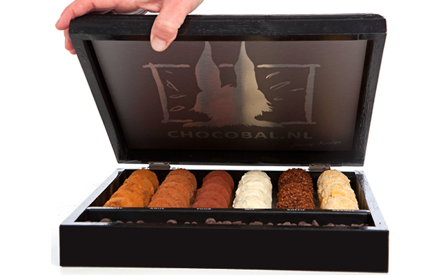 De chocoballen worden gepresenteerd in de houten kist.Alleen verkrijgbaar voor de horeca.